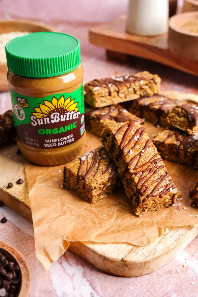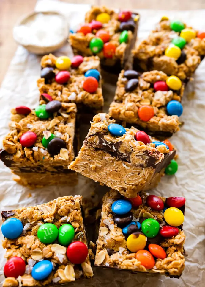 A fun and colorful protein bar packed with crunchy chocolate candy pieces, offering a perfect balance of sweetness and protein to power your day.